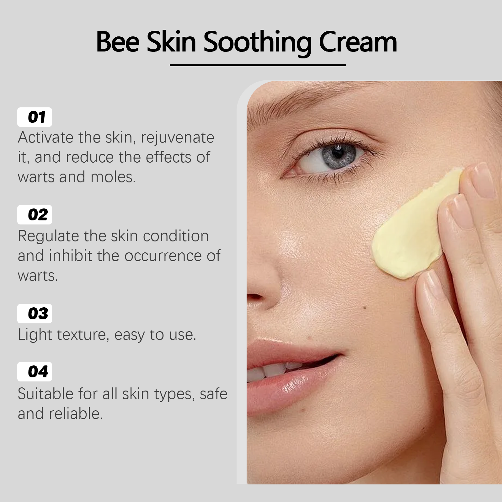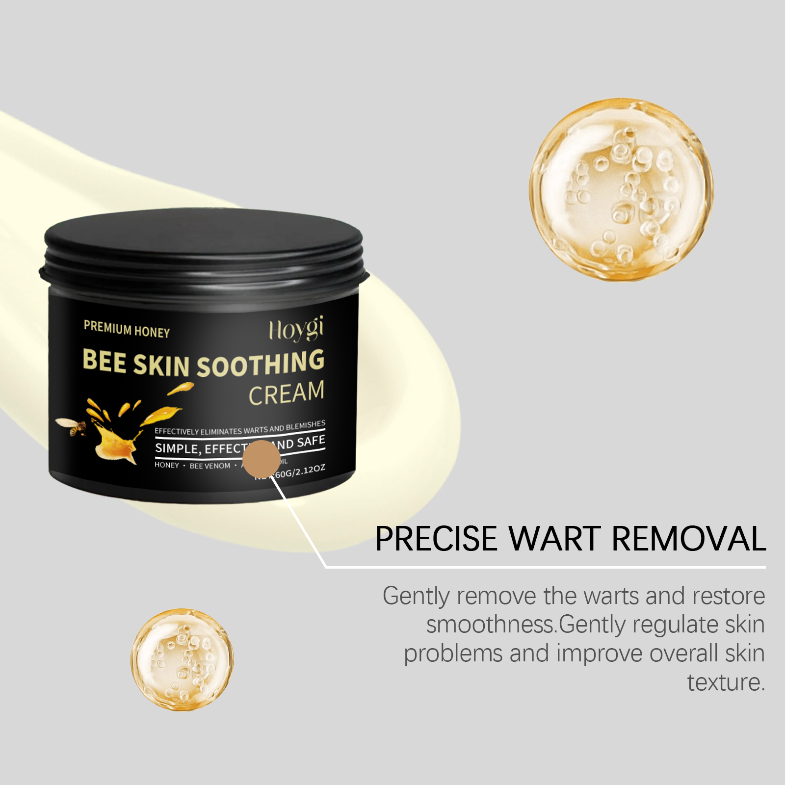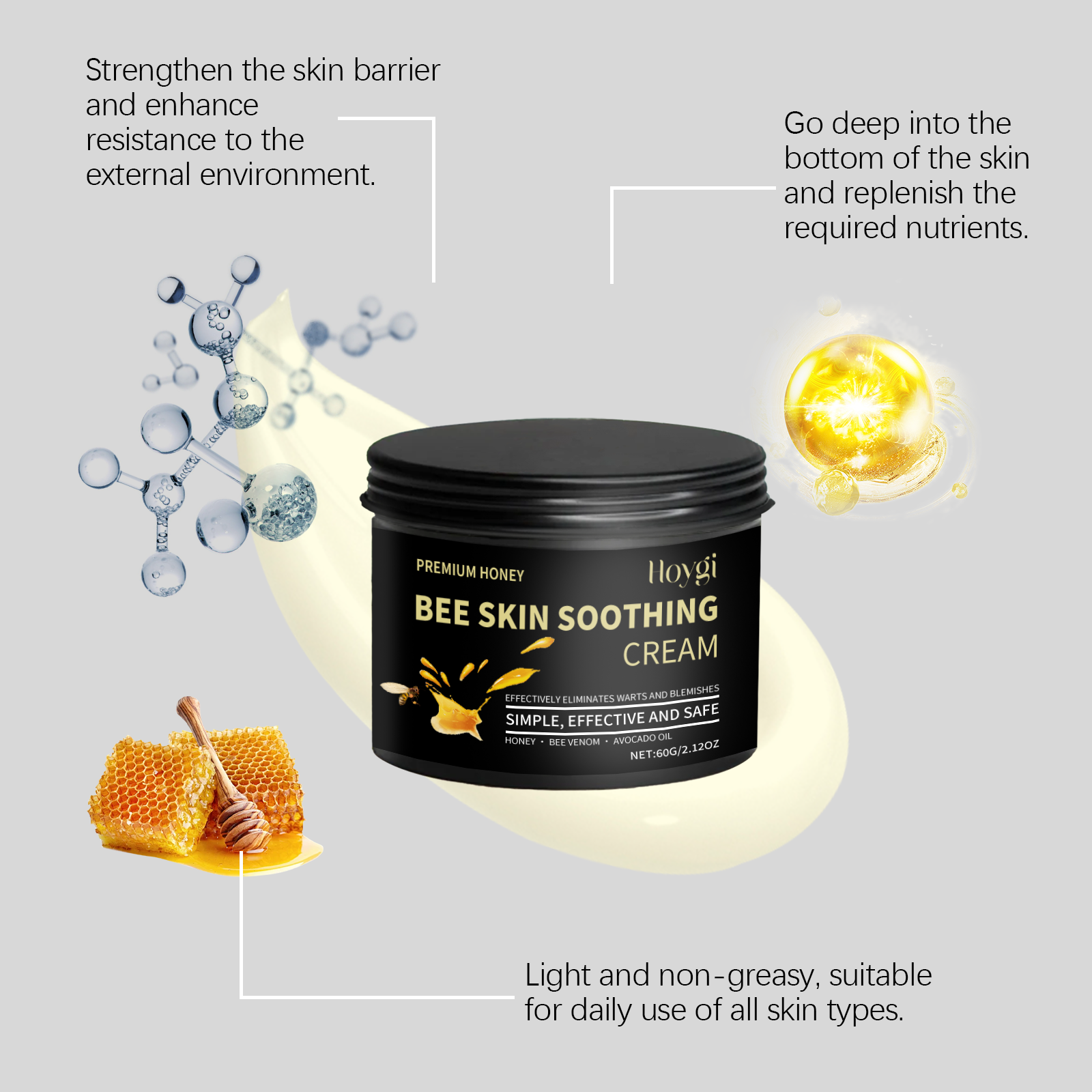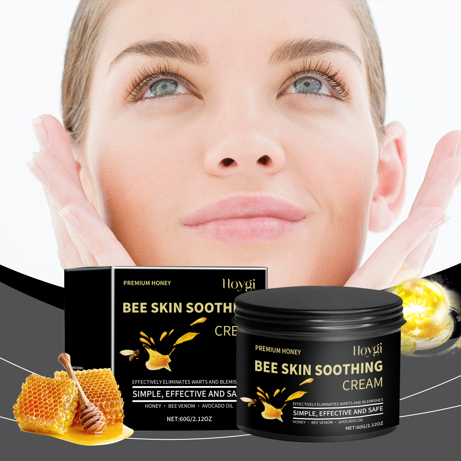 Our honey moisturizing cream contains honey, bee venom and avocado oil. It can help brighten the skin, restore its beauty and firmness. It improves the texture of the skin and makes it feel like silk. The application method is very simple: 1. Clean the skin and keep it dry. 2. Take an appropriate amount of this product and apply it evenly to warts and moles. 3. Gently massage in circular motions to allow it to be fully absorbed. It inhibits the regeneration of blemishes and, when used over a long period, makes the skin more uniform.